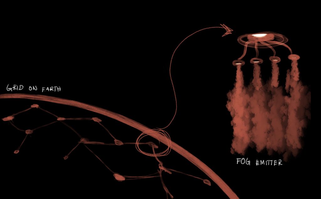 In the narrative, the drones lie buried beneath the desert, hidden from public knowledge. They rise only at night, releasing dense artificial fog that ensures Earth remains in a state of perpetual twilight. Their appearance, motion, and behaviour reflect their role as instruments of control, quietly rewriting the planet’s atmosphere while concealing the truth behind its collapse.