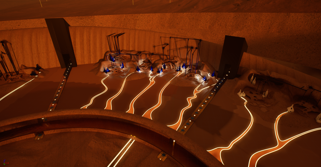 The harvesting system channels liquid light from the city above into a protected underground space carved into the dunes. Four gated entrances lead into this hidden chamber, where a sculpted channel carries the light toward a cooling tower and into a central basin. Here, the liquid light is regulated, stored, and then redistributed through an underground network that powers the Light Bearer homes above.