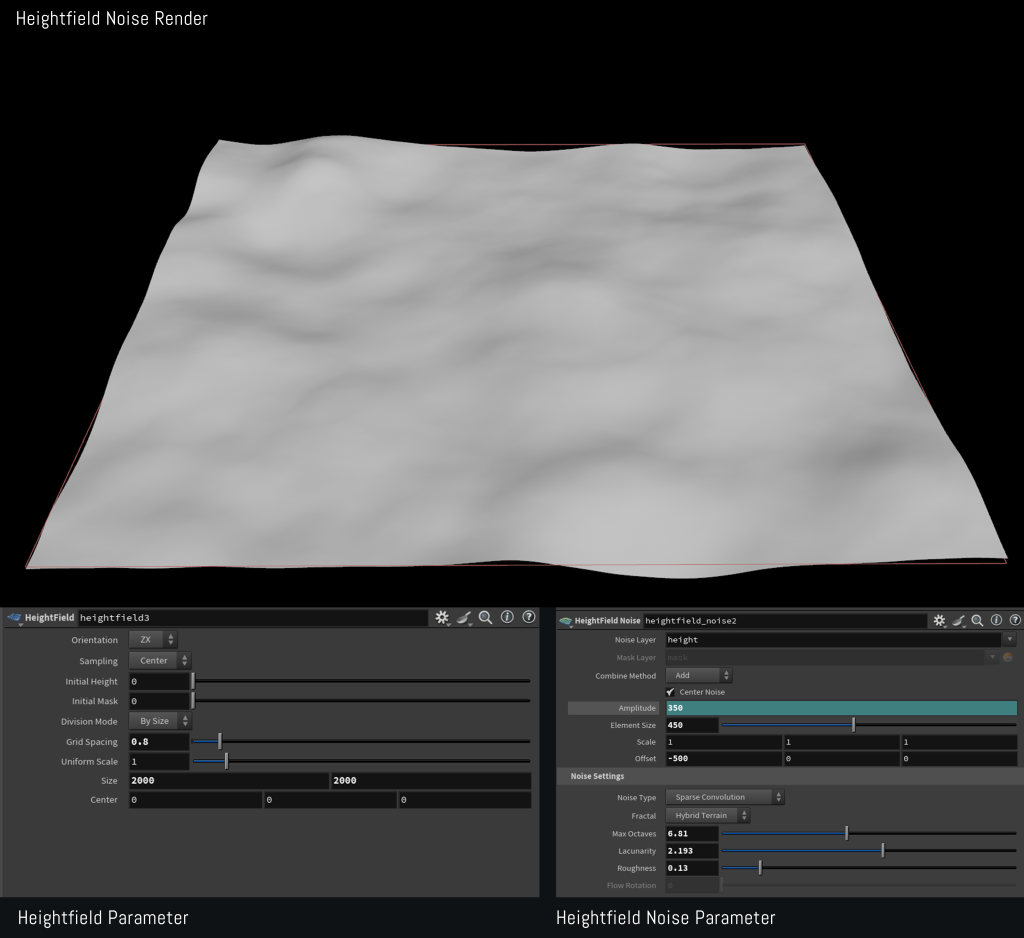 The desert environment was generated procedurally to capture the natural flow and erosion patterns of real dune landscapes. A heightfield served as the foundation, shaped using layered noise to establish broad dune formations. Additional distortion and detail were introduced through procedural nodes that mimic wind-carved ridges and subtle surface variations.