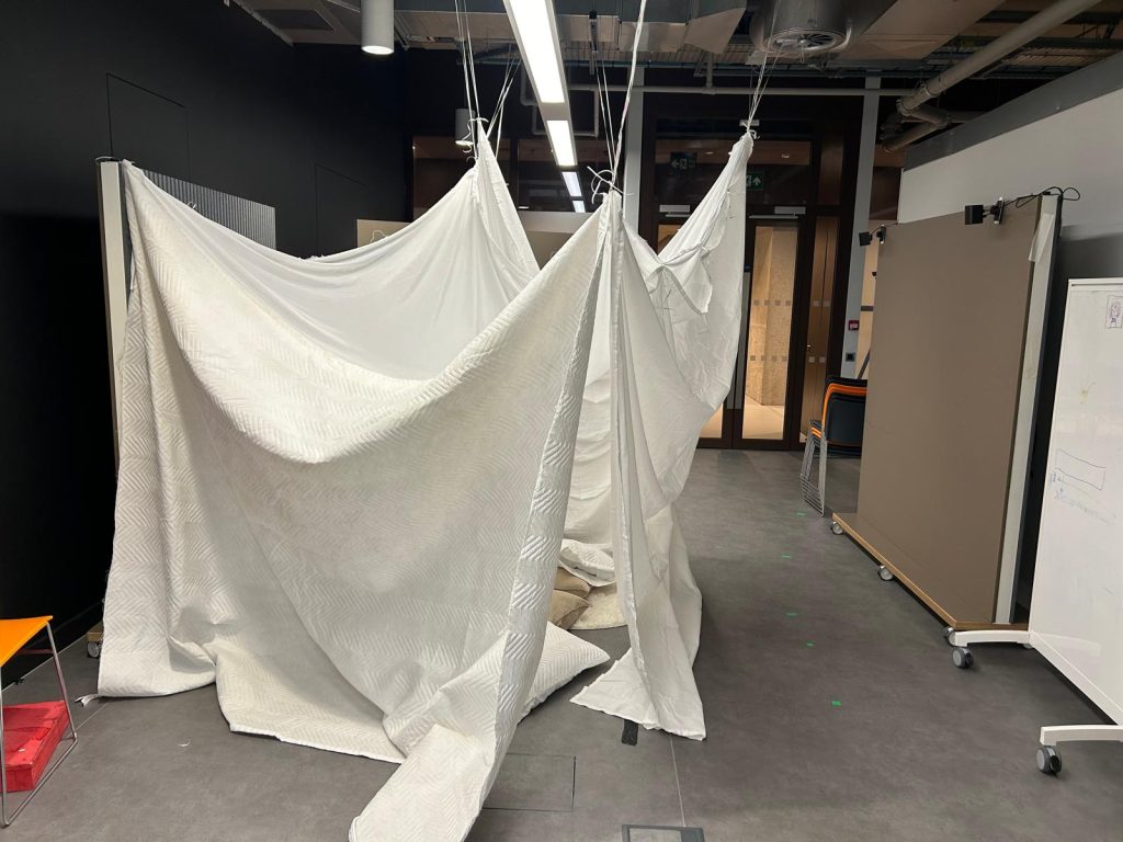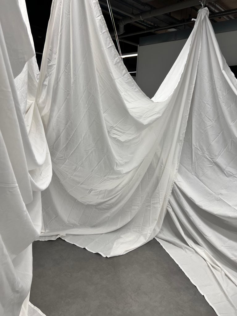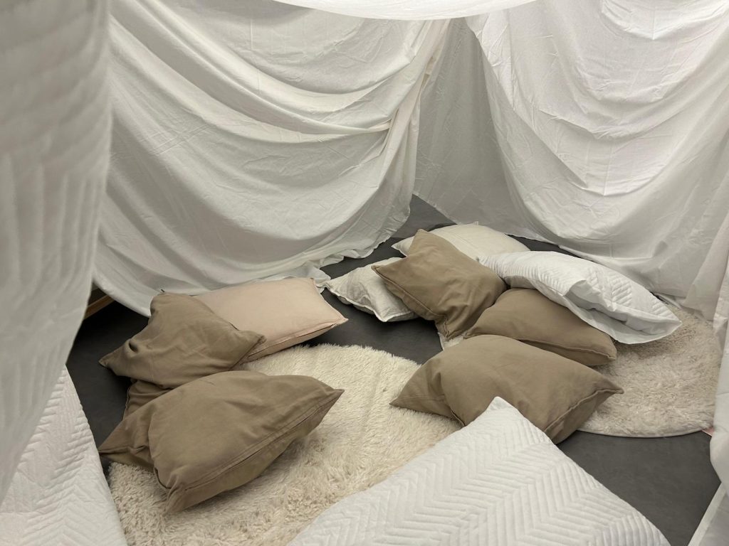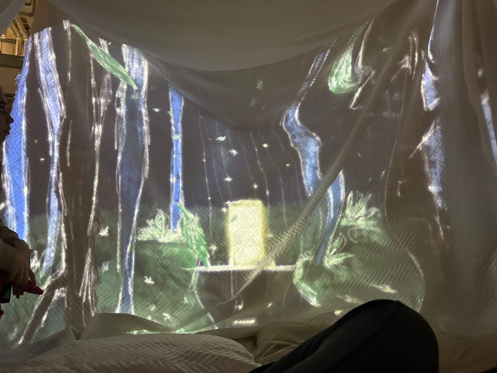 To build the fort, we assembled a soft, immersive environment using heavier fabrics that could hold projected light without warping. The sheets were suspended from the ceiling pipes with rope, creating a canopy-like enclosure. The interior was furnished solely with soft materials, pillows, blankets, and rugs, to create a fully cushioned environment that enhanced both comfort and immersion.