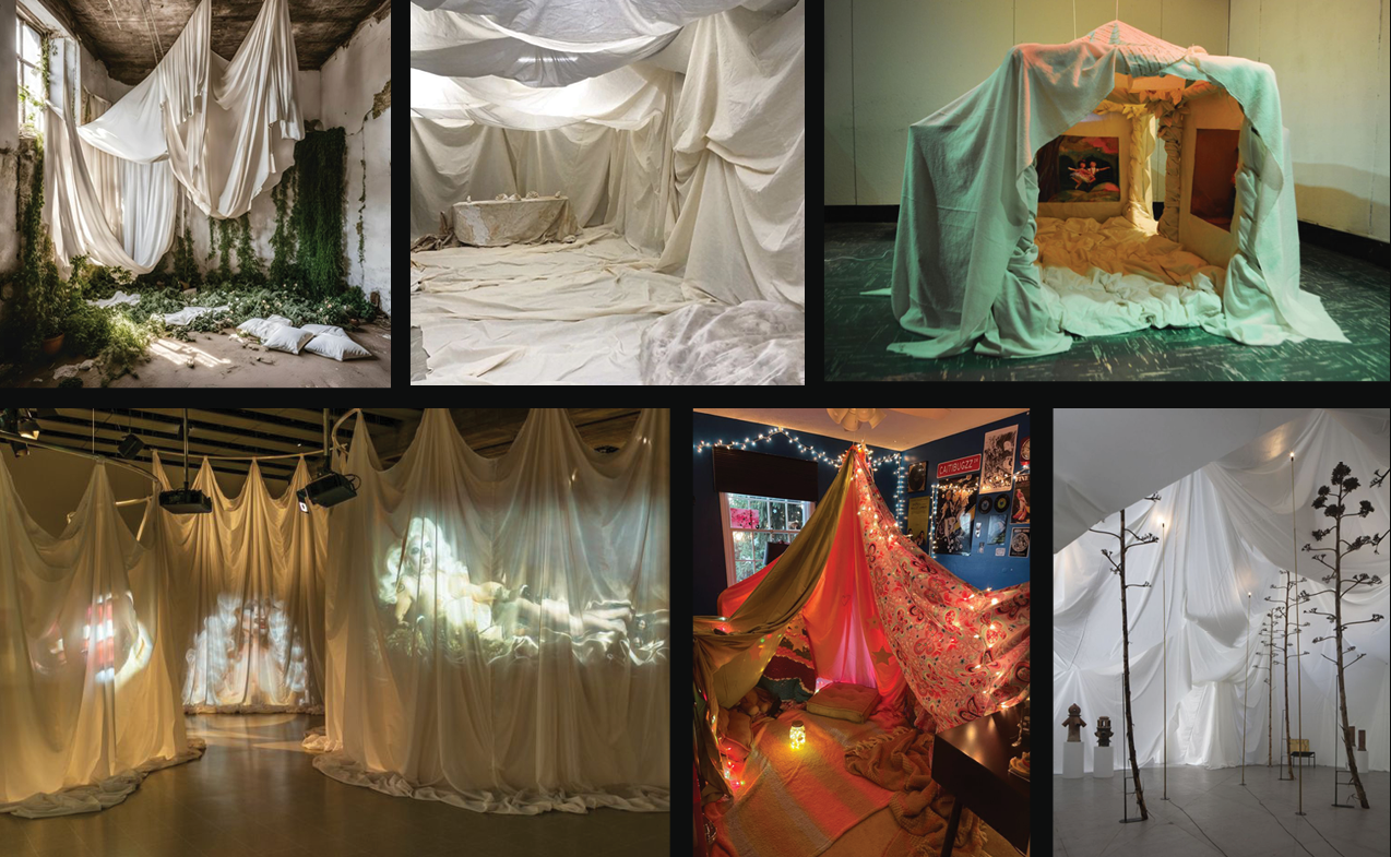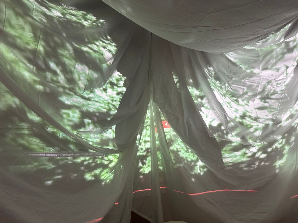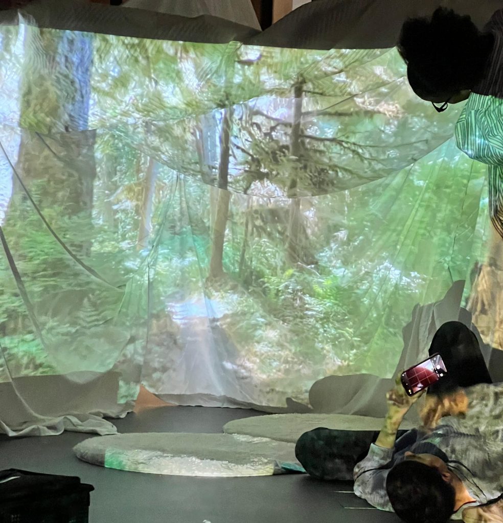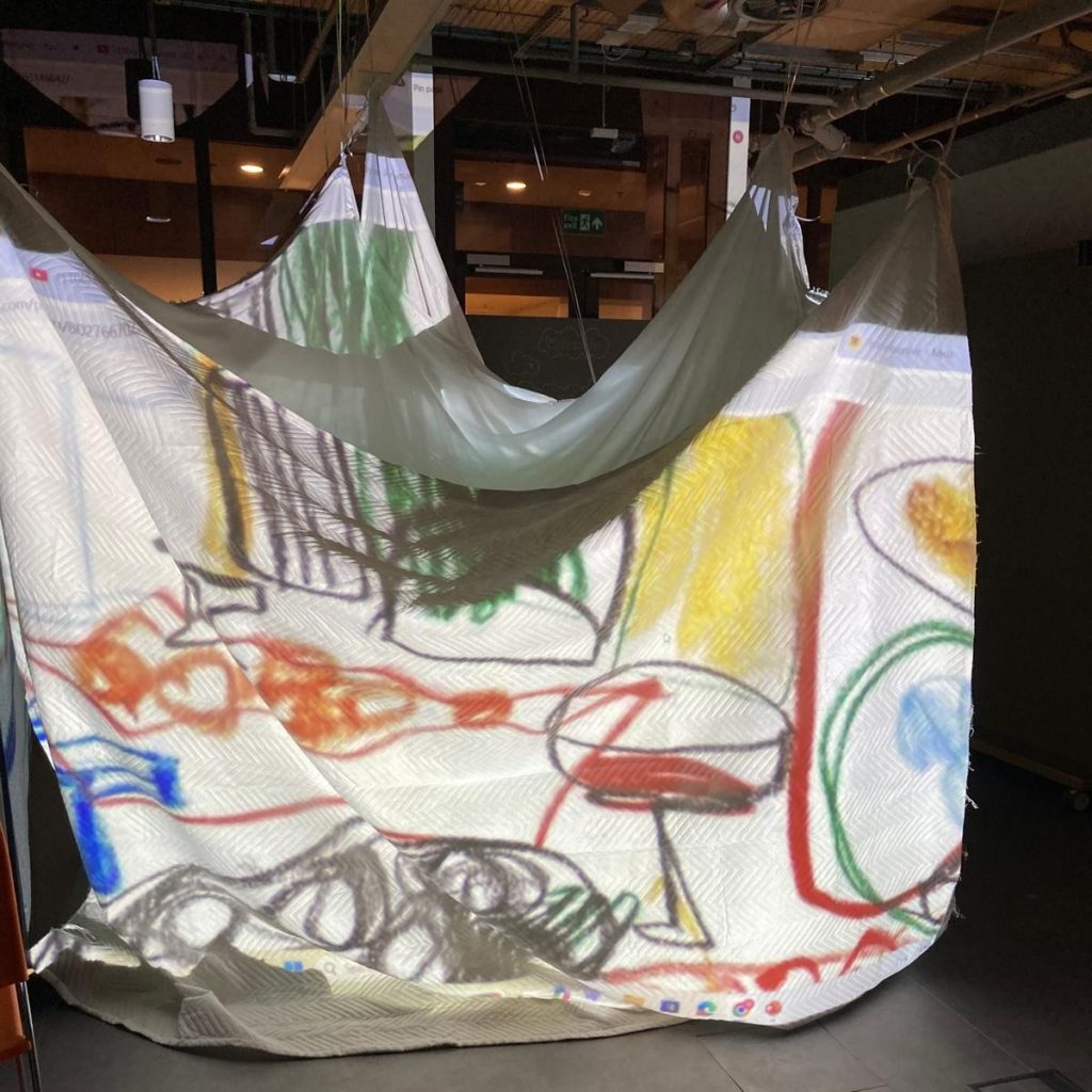 To build the fort, we assembled a soft, immersive environment using heavier fabrics that could hold projected light without warping. The sheets were suspended from the ceiling pipes with rope, creating a canopy-like enclosure. The interior was furnished solely with soft materials, pillows, blankets, and rugs, to create a fully cushioned environment that enhanced both comfort and immersion.