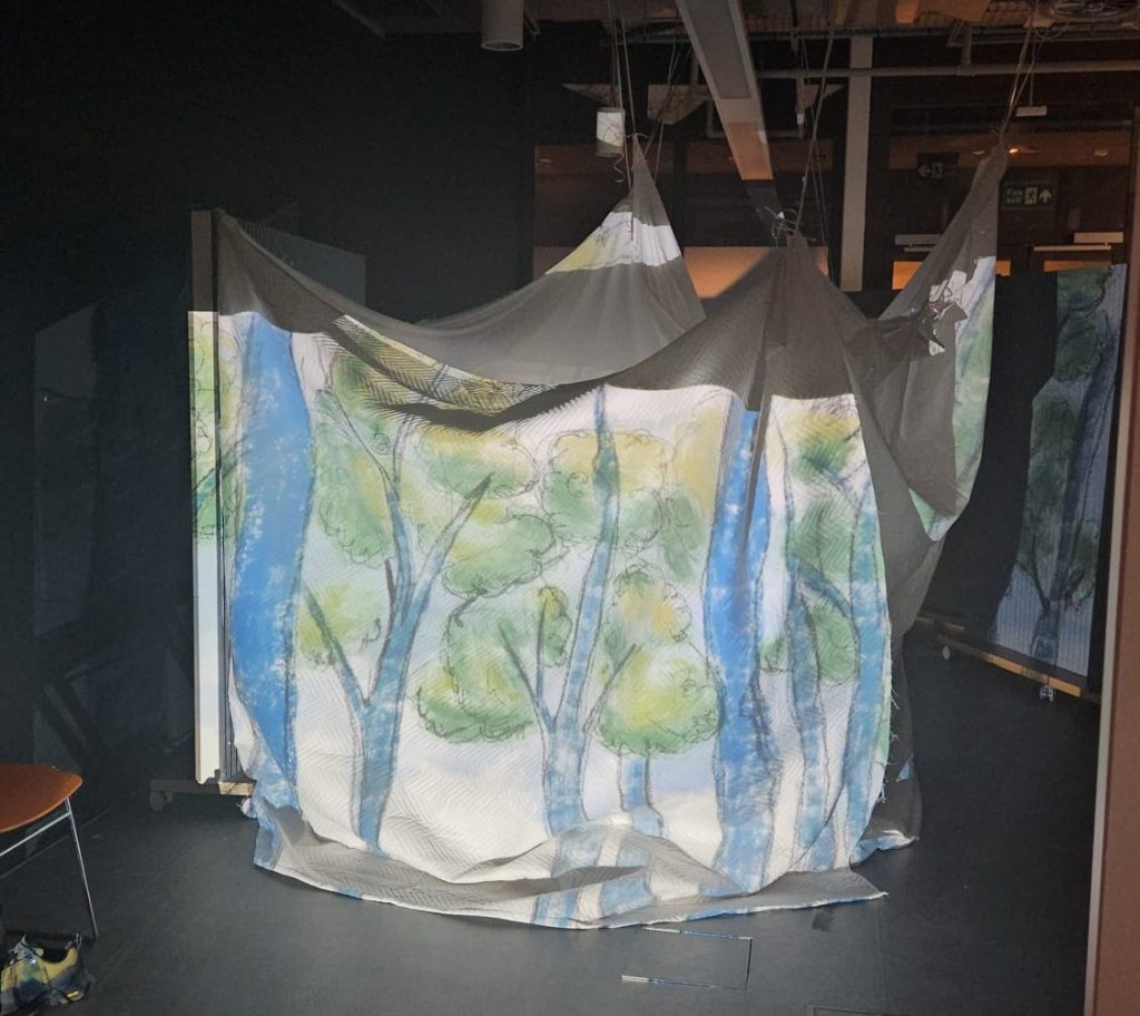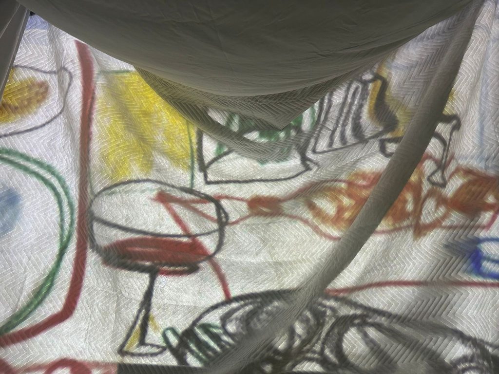 To enhance the immersive experience, we used two projectors to envelop the fort’s occupants in projections and atmosphere. One was positioned 5 meters in front of the sheet to maximize coverage, and the other was placed at the back. We conducted test runs with various art styles to identify what worked best with the materials.