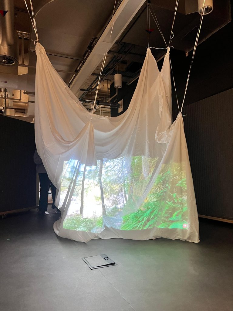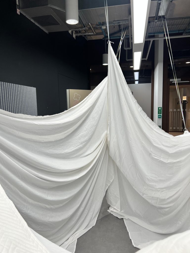 We chose white, soft sheets to enhance projection clarity and crafted flowing geometry to evoke a cocoon-like, immersive atmosphere.